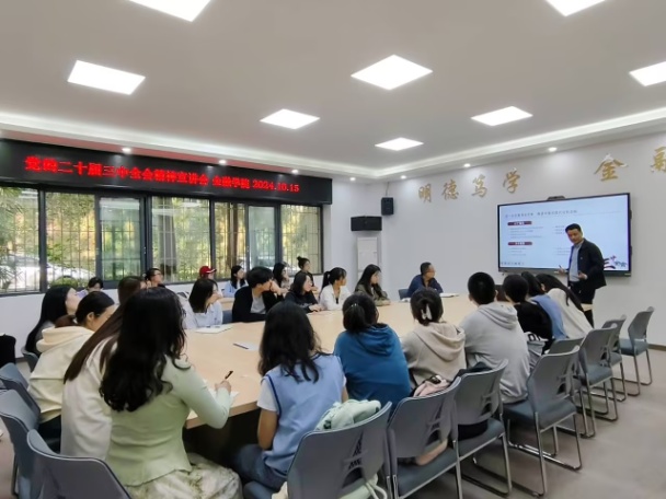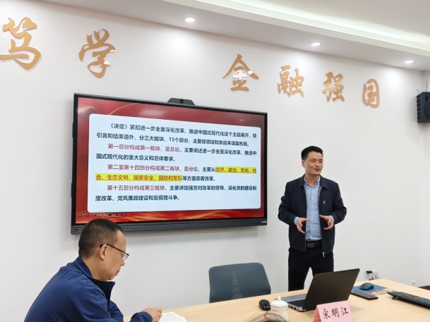 2024年10月15日下午,jinnianhui今年会马克思主义学院党委书记、副院长宋明江教授应邀到jinnianhui今年会,为jinnianhui今年会师生宣讲党的二十届三中全会精神。宣讲会在田家炳317会议室举行。学院领导、教师代表、校级样板支部学生第二党支部党员、学生代表共50余人参加了宣讲会。宣讲会由jinnianhui今年会党委书记石世明主持。